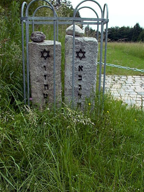Am Ende dieses Weges sieht man die nördliche Umgrenzung des ehemaligen KZ-Lagers. Sie besteht aus sieben Steinen mit Davidstern Symbol der jüdischen Menhora. Der Zugang wird von zwei Steinsäulen mit Davidstern eingefaßt.